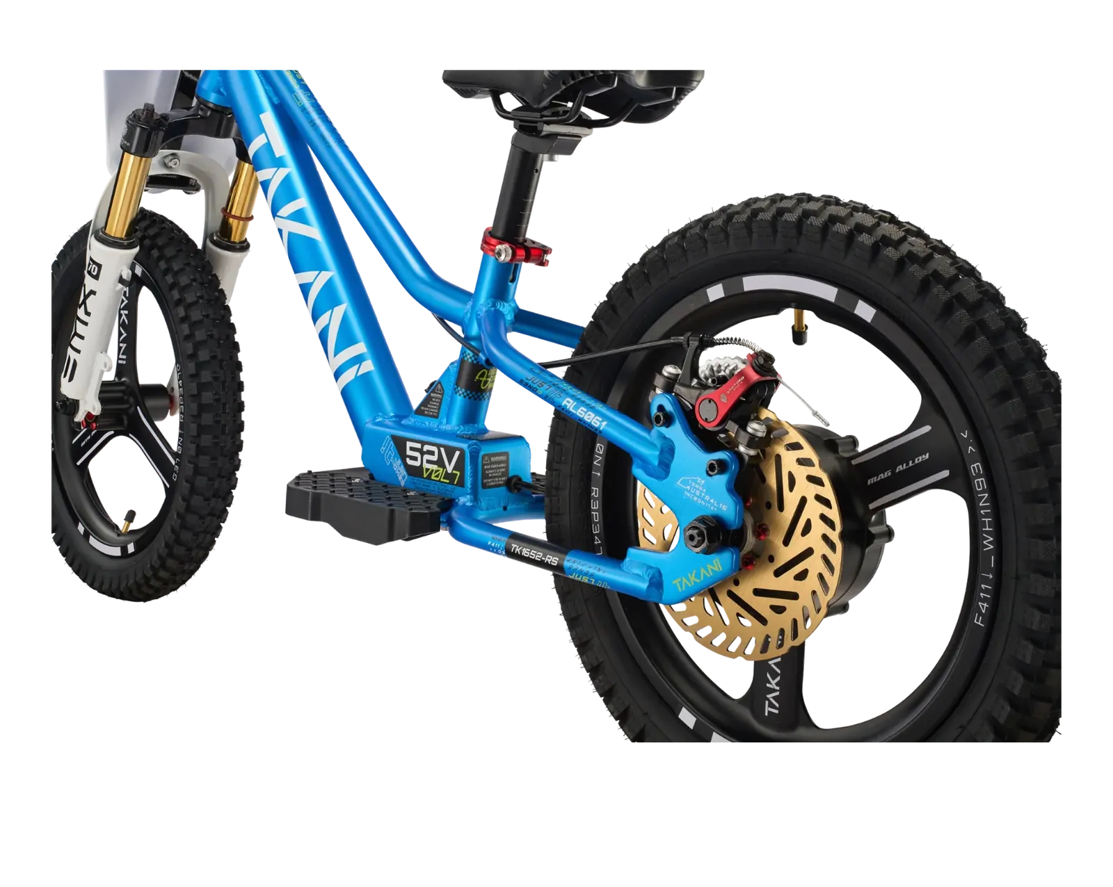 Adjust it to the speed setting you like. Let the rider gain confidence according to their skill level. TAKANI products are built with durability and performance in mind. The balance bike features a state of the art, brushless ‘high speed’ and ‘high torque’ hub motor with little moving parts that can break. Focussed on safety, we have fully integrated the juicy 48V lithium battery into the frame. This is to protect from the elements, bumps, dirt and to optimise the bike’s centre of gravity. Rest assured, with a minimum run time of 1hour the ride does not end too soon, but in line with your youngsters (and parents!) attention span. Always wear protection gear, ride on private property….. and have HEAPS OF FUN!